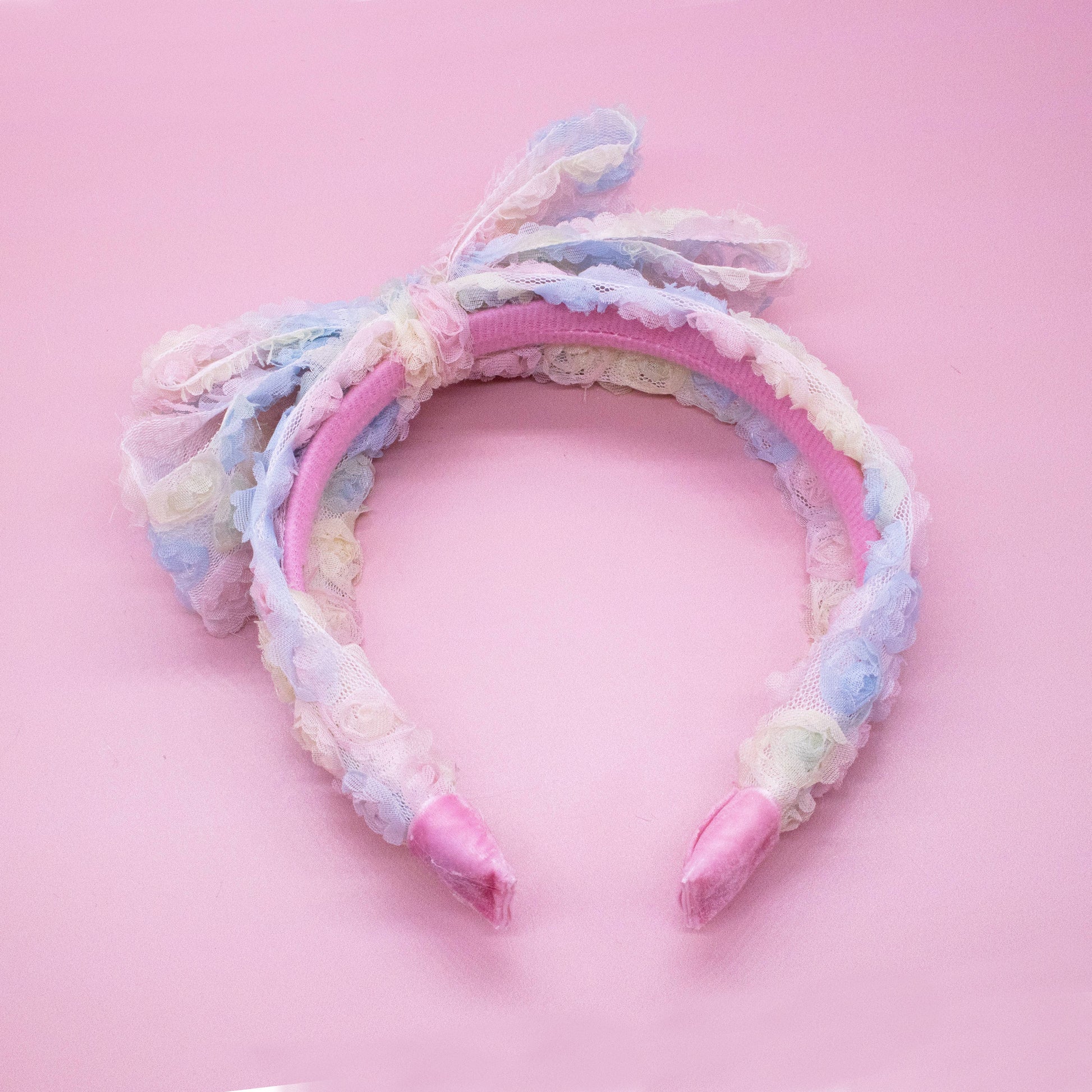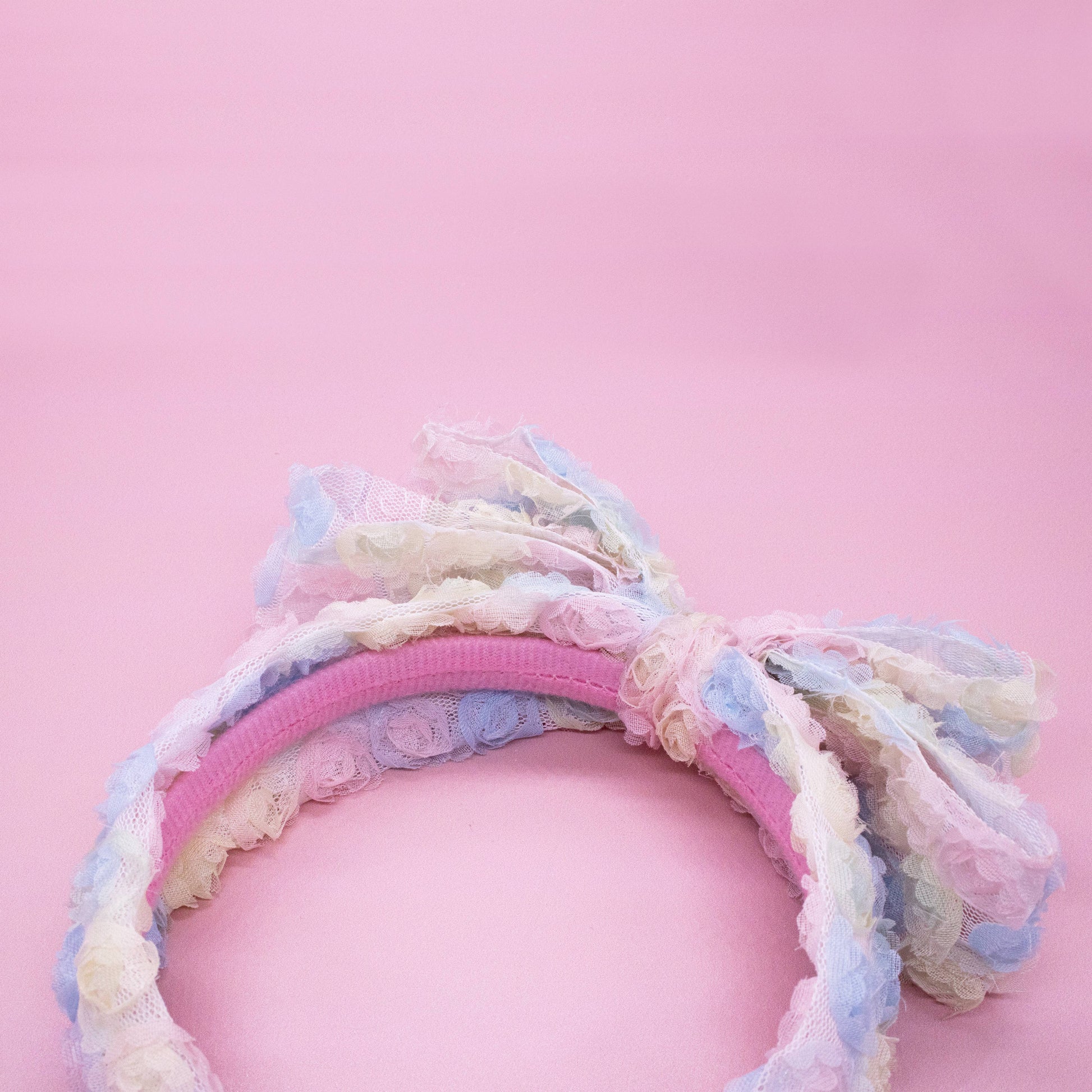 Two layer big bow headband. Mini tulle rosette fabric in rainbow pastel colors. 13 inch circumference to best fit toddlers to tweens!