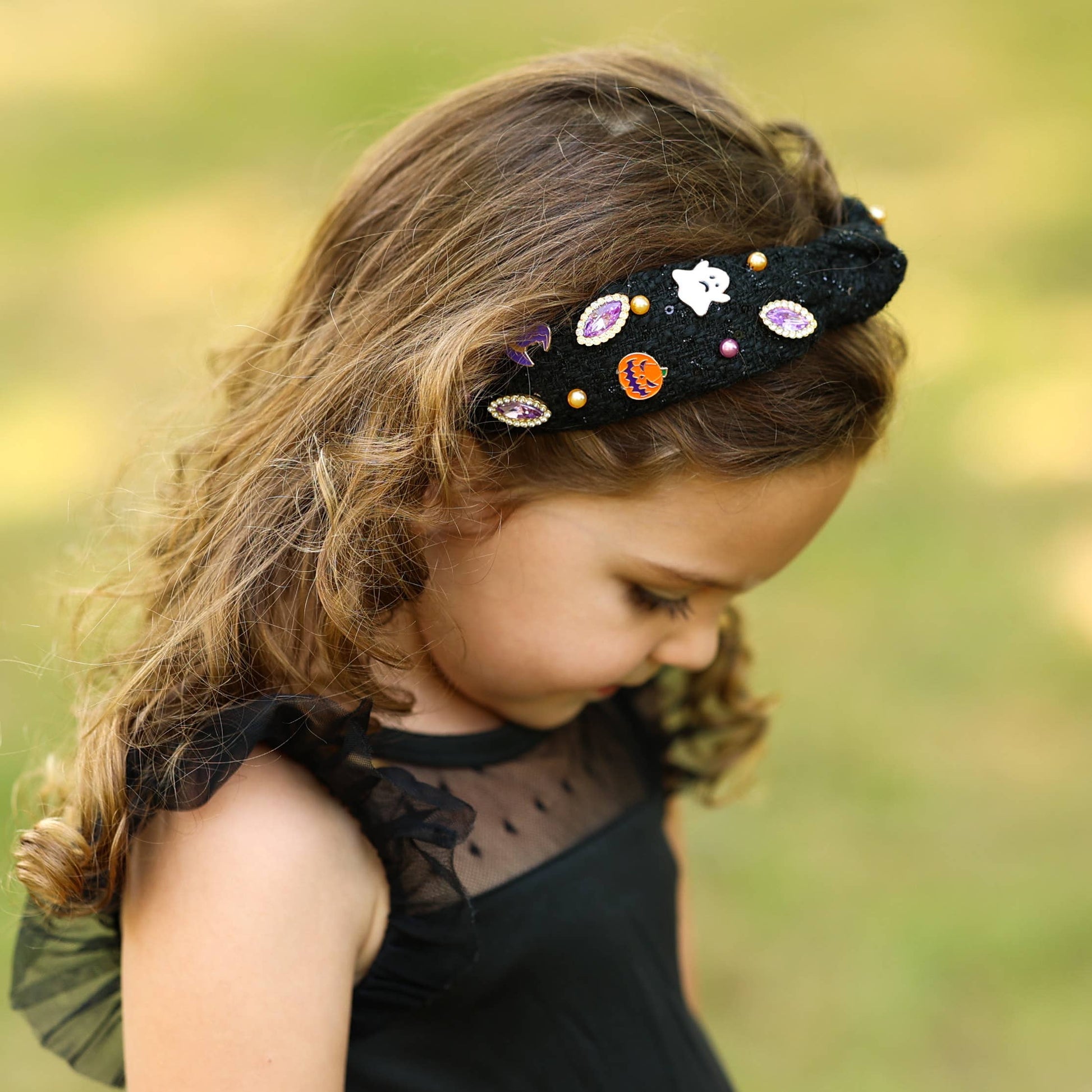 Halloween charm knotted headband for girls. Black tweed fabric offers a stylish halloween headband choice. Embellished beaded headband with purple rhinestones, pink and gold beads, and enamel charms - ghost, pumpkin, witch. 13" head band size to best fit toddlers to tweens, making it perfect for kids headbands collections.