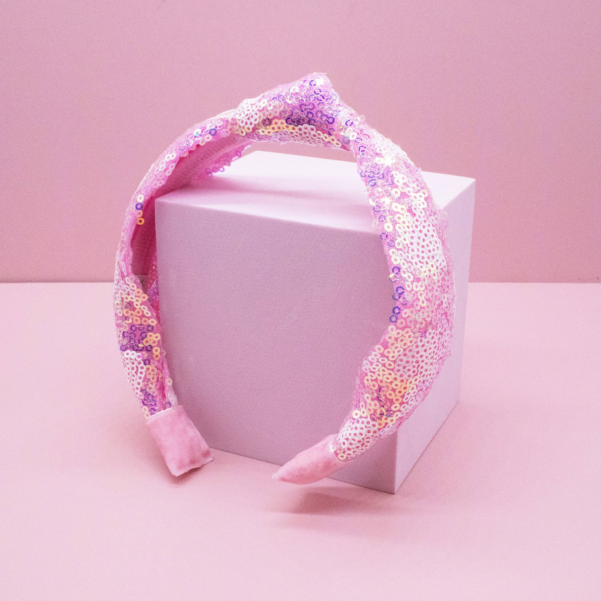 Kids sequin knot heart headband. Color - Pink with white hearts. Shimmering iridescent sequins. Hard headband size 13" circumference - Best fits toddlers to tweens. Comfortable for all-day wear.