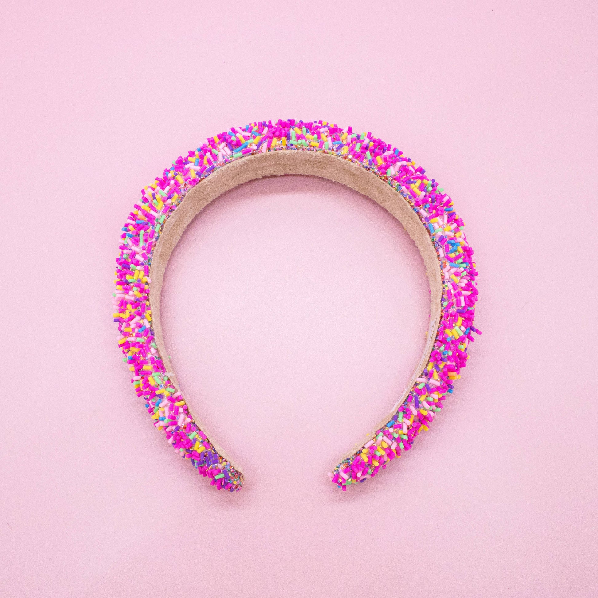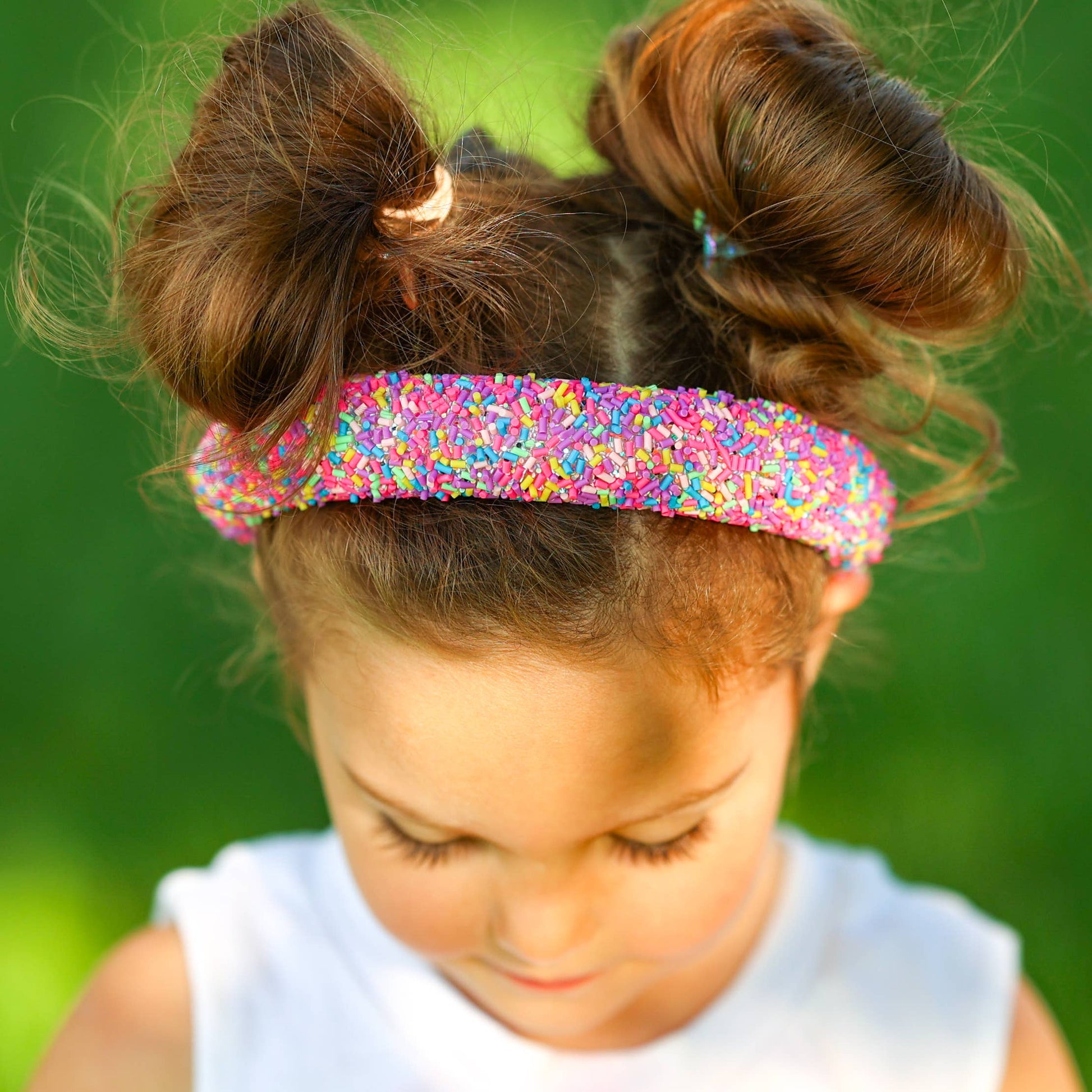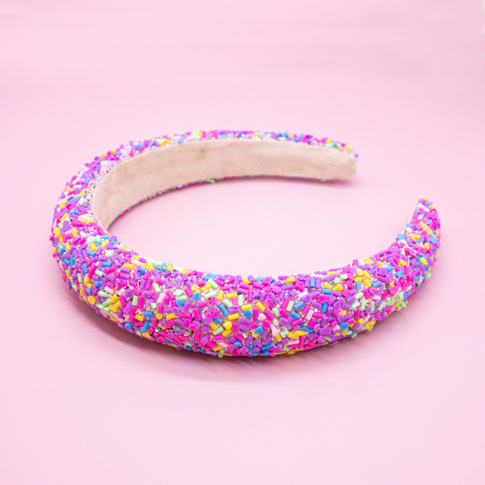 Puffy tapered headband for girls. Embellished with rainbow confetti sprinkles. Colors - pink, purple, or blue. Flexible band with a comfortable inner lining. 13 inch circumference to best fit toddlers to tweens.